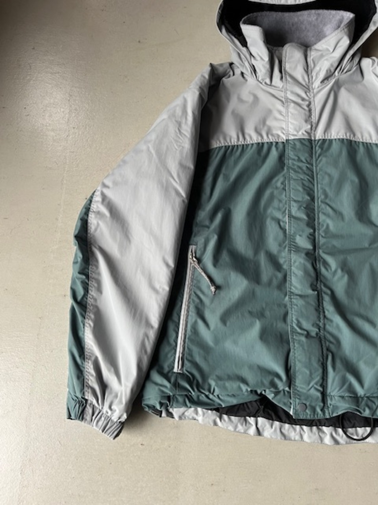 ライトグレー×グリーンのバイカラー、シンプルながら保温性に優れたモデル。
